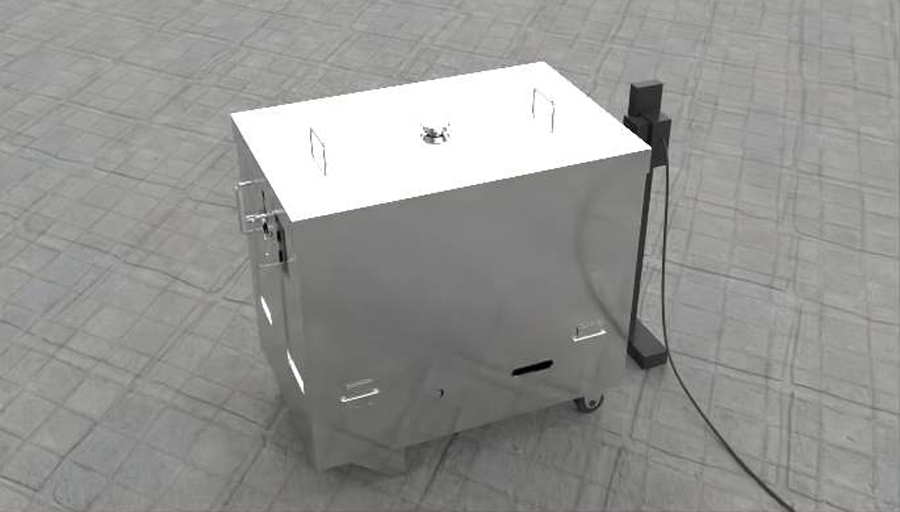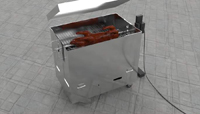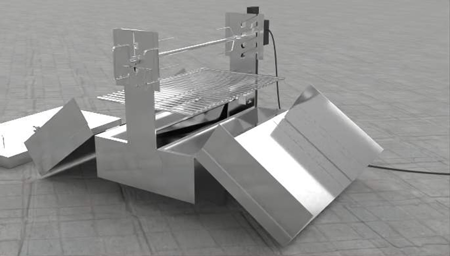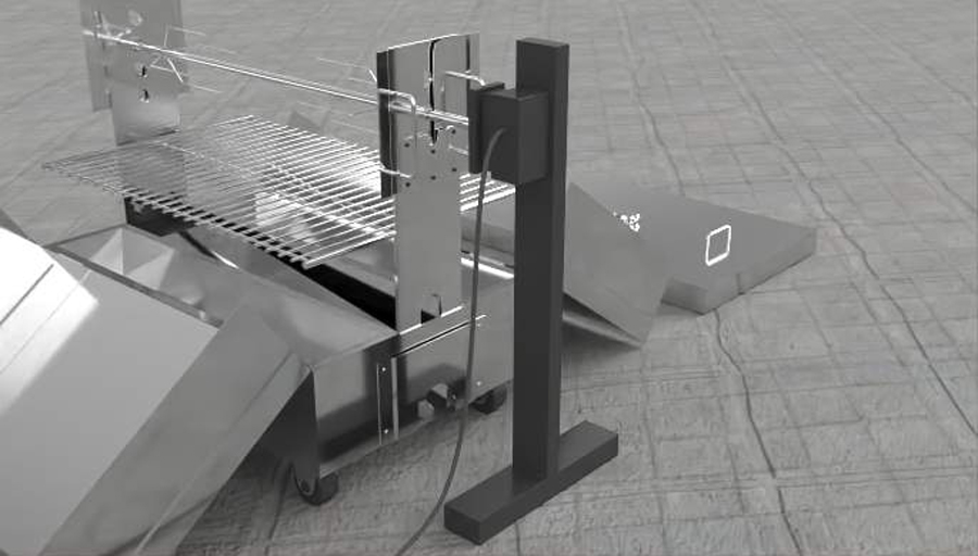 Users can easily transport the system when it is compacted into a suitcase-style configuration. There are one or more handles used to pull the system along the ground via the wheels. Once a location is reached, the exterior covers can be removed, and the cooking system can be expanded to utilize the rotating spit.